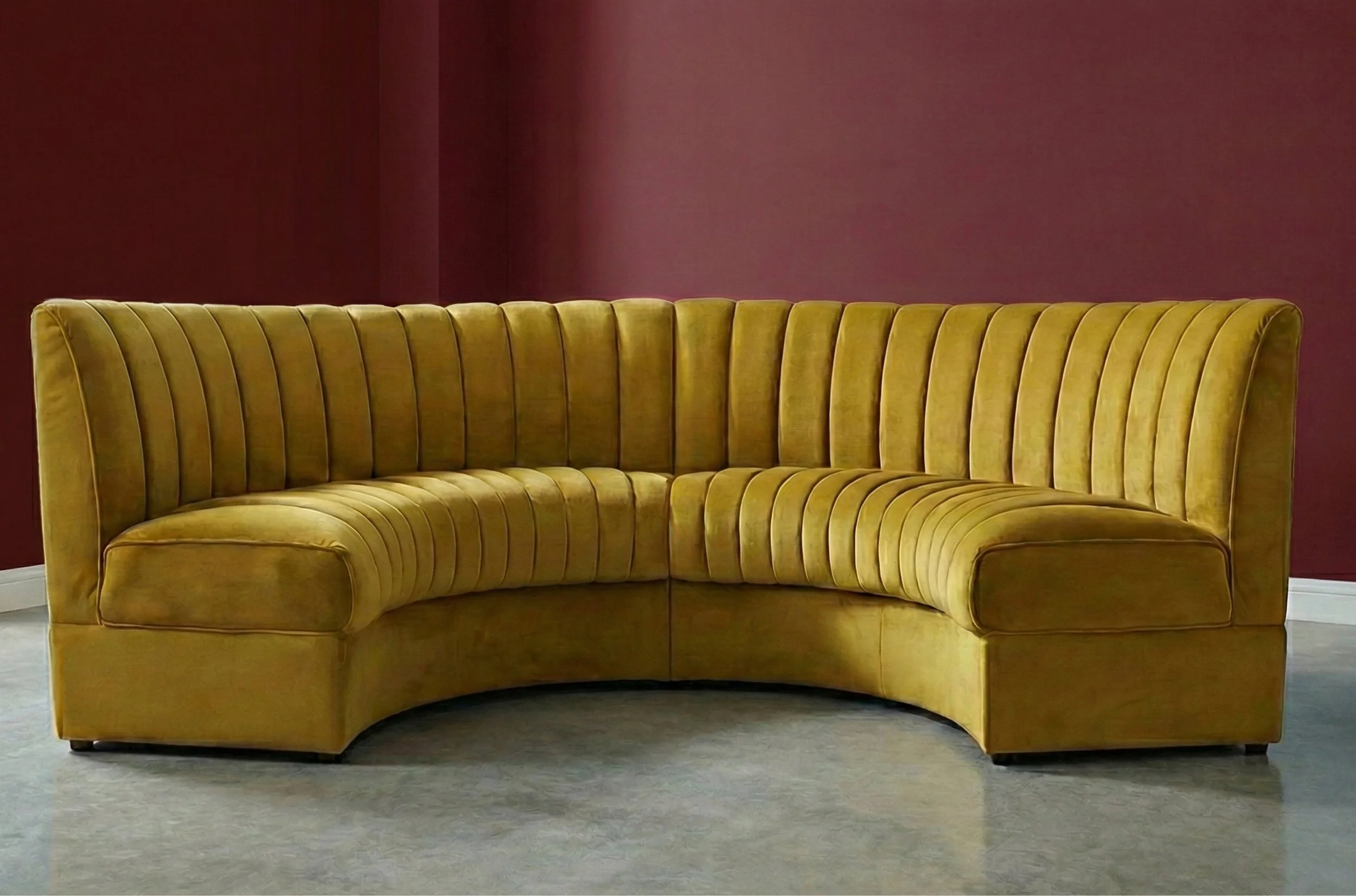 Mix geometric pieces with something softer or curved. A tailored sofa beside a woven accent chair. A sleek bench layered with a plush cushion. Texture is what keeps an event setup from feeling flat!